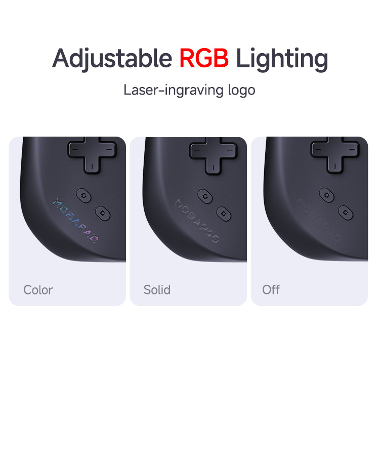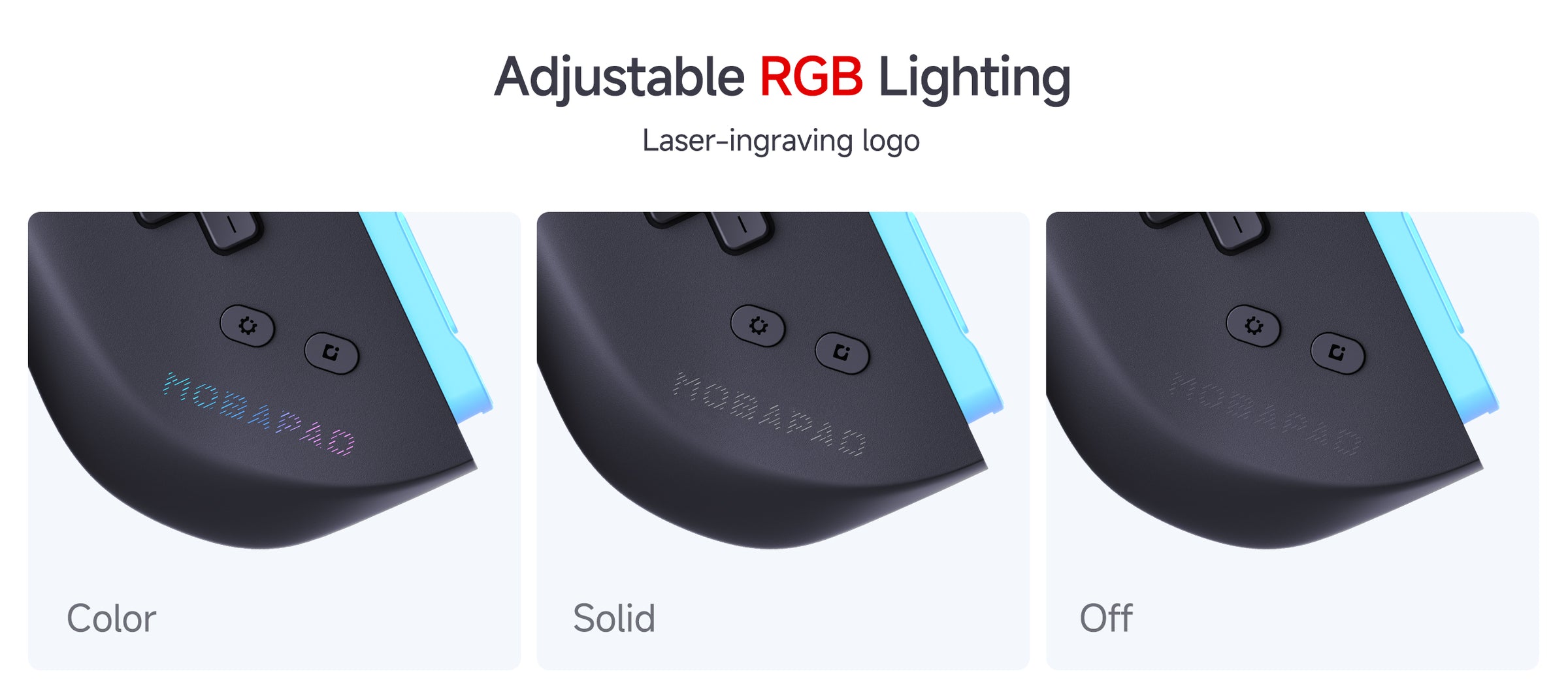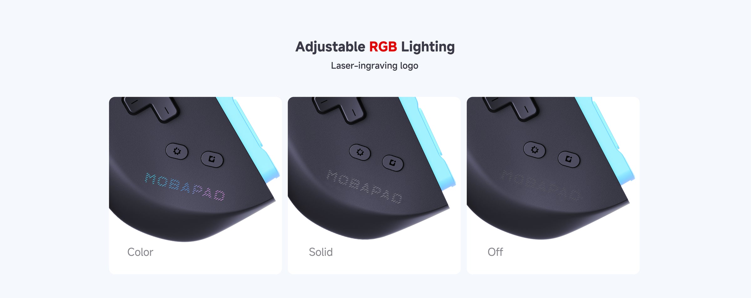 Die Logos auf den Controllern Mobapad M12 HD und M12S Switch 2 werden mittels Lasergravur hergestellt, und sowohl die Helligkeit als auch die Lichteffekte des Logos können angepasst werden.